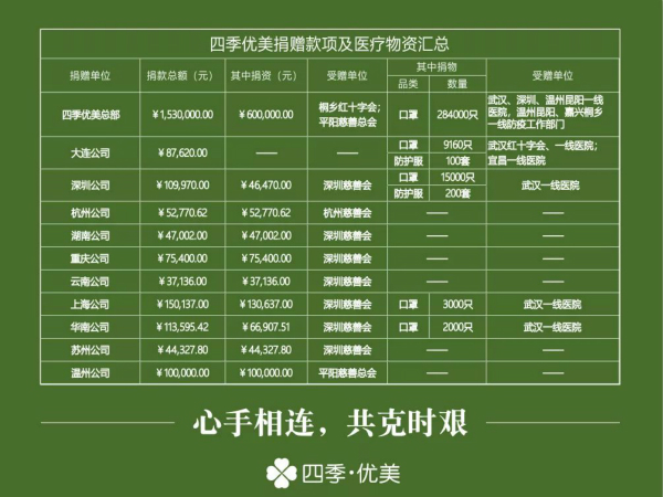自1月26日四季優(yōu)美公司捐贈(zèng)的第一批價(jià)值約90萬(wàn)元的普通醫(yī)用口罩送達(dá)抗疫第一線后,公司再次聯(lián)合全國(guó)各分公司開展第二批用于抗擊疫情的定向捐贈(zèng),用實(shí)際行動(dòng)詮釋了“責(zé)任”這一企業(yè)文化關(guān)鍵詞的內(nèi)涵。