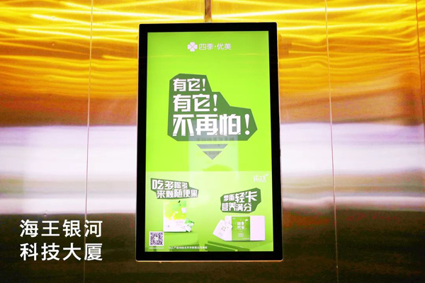 與此同時,位于深圳的高端寫字樓海王星辰大廈內也出現了一抹活力四射的四季優美綠——融入寫字樓電梯廣告元素的線下地推正向人們傳遞著四季優美的健康理念和品牌形象。