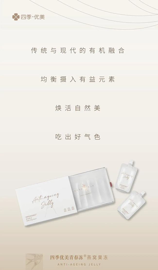 或在清晨醒來時,或在工作疲憊間,一袋四季優美青春凍燕窩果凍,開蓋即食,免去挑毛、燉煮的繁瑣,是現代感,也是儀式感,我們獲得的,除了唇齒間的美好享受,似乎還有一種因未來可期而產生的幸福,以及順應天時的踏實。正如《舌尖上的中國》總顧問沈宏非先生所言:“一匙燕窩入口之際,萬千寵愛以及百般呵護,全部都寫在了臉上。”