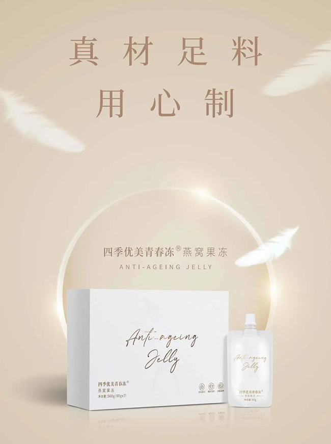 四季優美青春凍選用的燕窩,均產自全球優質燕窩產地,經第三方機構測定,四季優美青春凍的燕窩酸含量達110 m g / 1 0 0 g。每一袋四季優美青春凍所選用的燕窩,全部可掃碼溯源,獲取從生產、出口到進口、流通的相關信息,從而為每一位消費者的安全保駕護航。