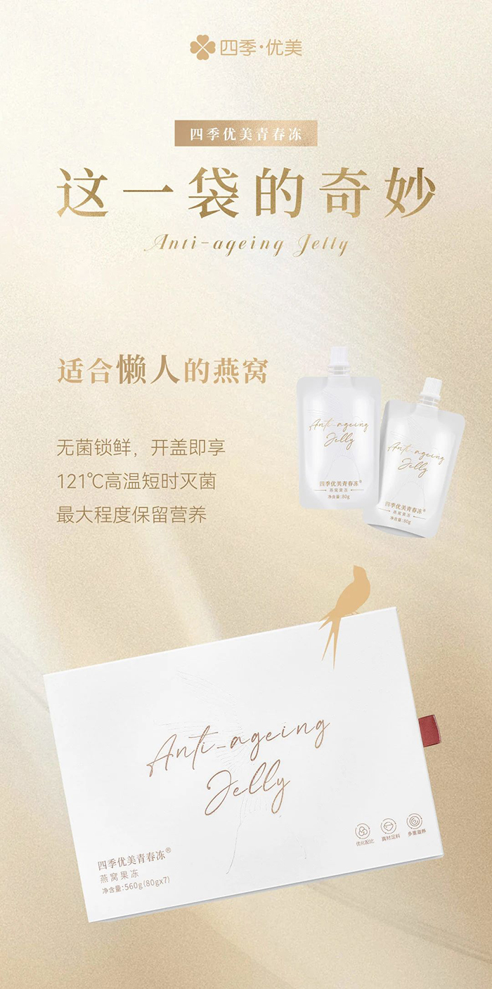 在飲食美學的殿堂里,燕窩以其獨特的韻味,詮釋著“少即是多”的哲學。無需繁復的調味,僅以清水慢燉,便能激發出它最本真的甘甜與細膩。這份簡約,恰如人生中的留白,值得無限的回味與遐想。同時,燕窩又是“兼容并包”的食材典范,無論是百合、雪梨,還是木瓜、芒果,或者枸杞、紅棗,都能與它擦出動人的火花,演繹出舌尖上的美好。就像這一袋四季優美青春凍,除了至少1.2克的可溯源優質干燕窩之外,還貼心地根據現代人的身體所需,額外加入了魚膠原蛋白肽、葛根粉、奇亞籽、水蘇糖、低聚木糖、低聚果糖等多種原料,使四季優美青春凍在營養價值、飽腹感及產品綜合體驗方面,都實現了顯著的提升,為追求“清、調、補、養、固”的消費者們帶來更值得期待的選擇。